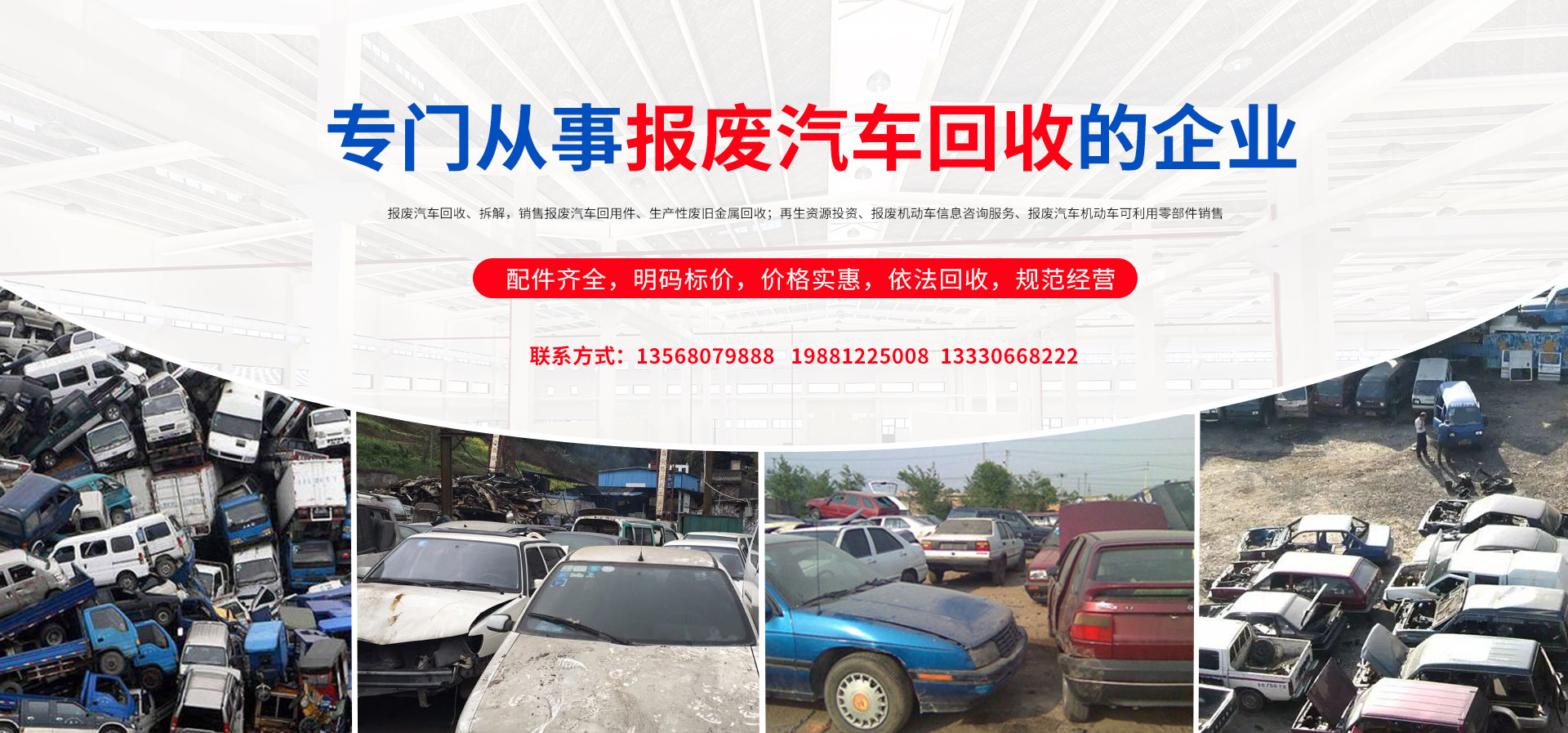我公司在報廢汽車回收拆解中,認(rèn)真貫徹執(zhí)行國家法律法規(guī),嚴(yán)格執(zhí)行國務(wù)院令第307號,積極開展行業(yè)自律,依法回收,規(guī)范經(jīng)營,從源頭上控制了報廢汽車整車、拼裝車、“五大總成”等上路和重新流入市場的現(xiàn)象,為緩解我市資源短缺,減輕環(huán)境污染,促進(jìn)資源循環(huán),維護(hù)人民群眾生命財產(chǎn)安全和道路交通安全起到了巨大的作用。